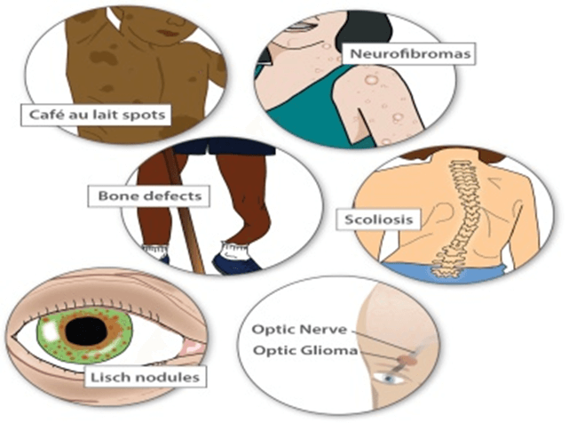 NF1 is a disorder characterized by the growth of noncancerous tumors called neurofibromas. Neurofibromas usually form on or just underneath the skin, as well as in the brain and peripheral nervous system. But they can also develop in other parts of the body, such as the eye. The disorder is caused by a mutation in a gene on chromosome 17. The gene codes for a protein called neurofibromin. This protein regulates the activity of another protein, called ras, which promotes cell division. When the NF1 gene is mutated, it usually leads to a shortened version of the neurofibromin protein that cannot bind to ras or regulate its activity. As a result, the ras protein is more active. Cells are told to begin dividing and never told when to stop, causing them to form tumors.